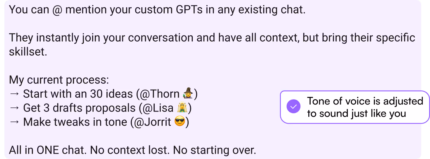 - Ask you to do a "brand voice check" to improve it further Result: Content that sounds so much like you, people will think you spent hours writing it yourself. Even if you've never posted before, you can share posts you admire and the GPTs will help you find your authentic voice.